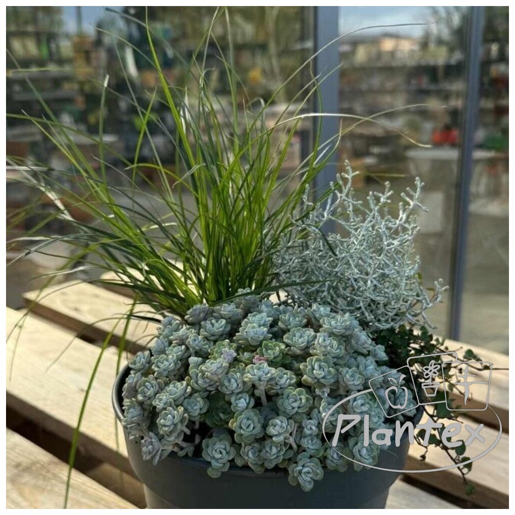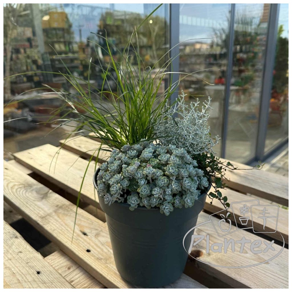 Kombinácia okrasných tráv, sukulentov a striebristých rastlín v modernom kvetináči. Nenáročná na starostlivosť, vhodná na terasu, balkón či vstup do domu. Oživí každý priestor elegantným prírodným dizajnom