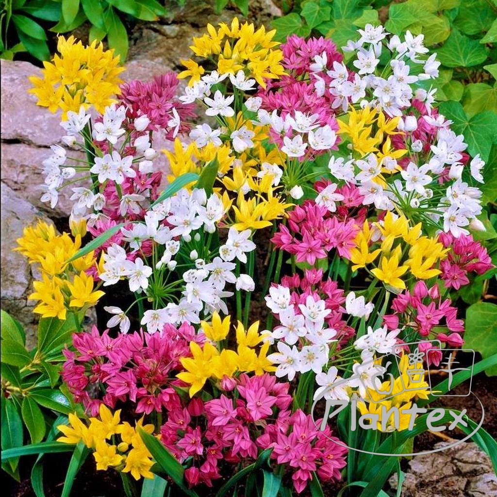 Cibule okrasného cesnaku je možné vysádzať na jeseň. Kvitne na jar, v období od mája do júla. Kvety sú žlté, biele a fialovo-ružové (mix farieb), vhodné na výsadbu do skaliek alebo skupinových výsadieb.