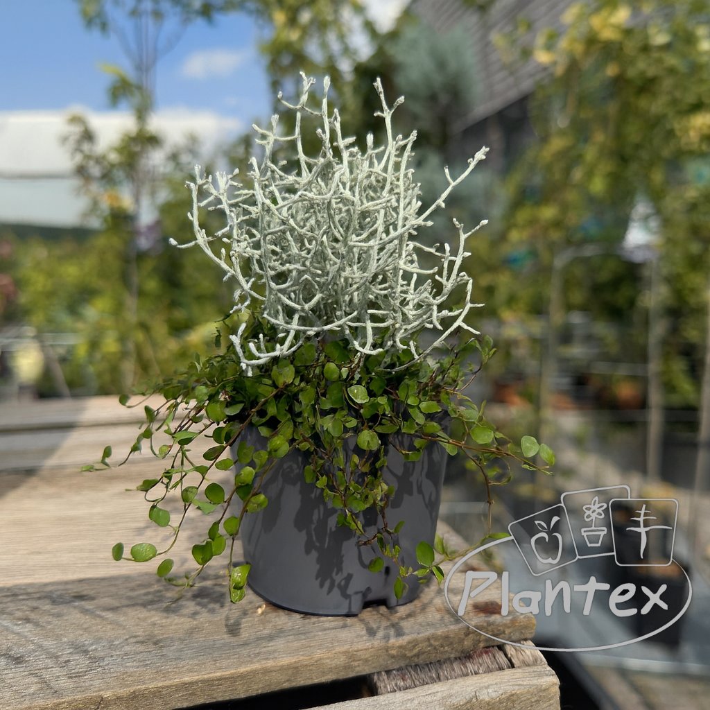 Calocephalus s Muehlenbeckia spolu vytvárajú elegantný kontrast farieb a tvaru vhodný do jesennej výsadby kombinovanej napr. s vresmi. Obľúbený mix na výsadbu v moderných nádobach na terase alebo balkóne.