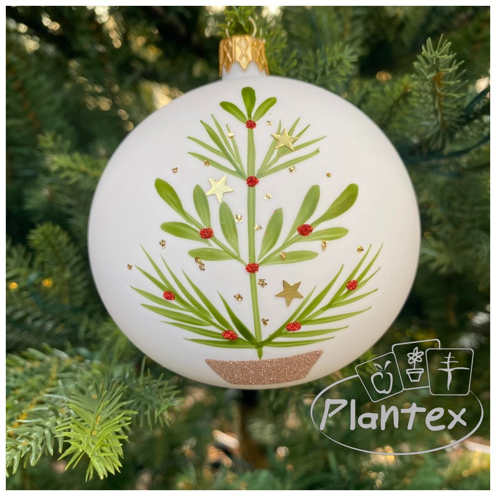 SKLENENÁ VIANOČNÁ OZDOBA - BIELA GUĽA S ARAUKÁRIOU (7 CM)